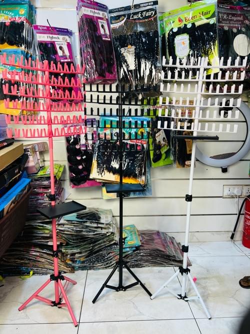 A braiding rack is a specialized tool used by braiders to hold, organize, and prep extensions—such as braiding hair, Marley hair, or pre-looped crochet hair—during hair styling. It boosts efficiency by allowing braiders to pre-part and store hair, enabling rapid access during feeding, knotless braids, or box braids, which ultimately saves time and keeps the workspace tidy.